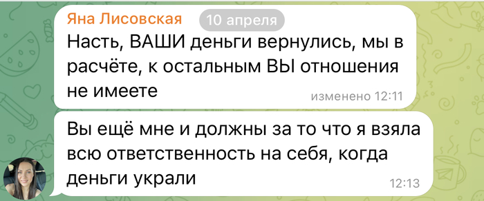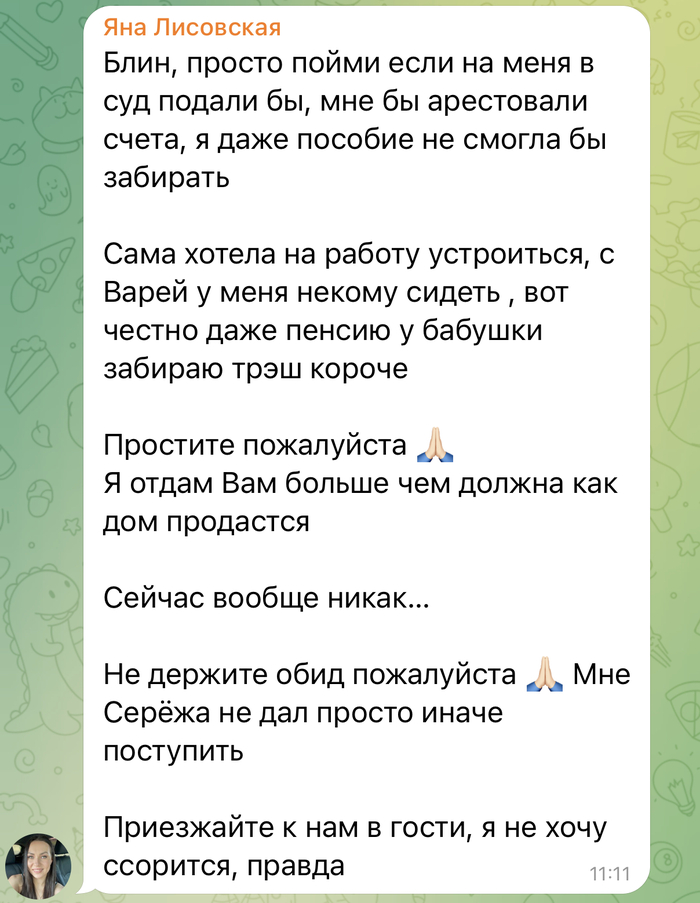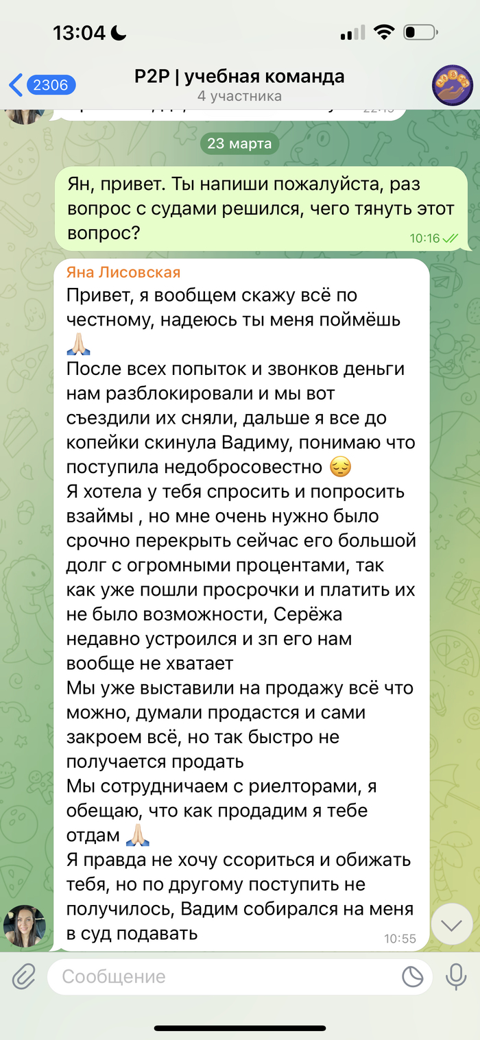 Но я с таким раскладом была не согласна, да и законы знаю, поэтому начала настаивать, чтобы делом занялся мой юрист и требовала показать нам материалы, активно вовлекалась в процесс. Когда стало понятно, что Яна темнит, мои просьбы стали настойчивее и я заговорила о выводе полностью моей оставшейся доли из дела. Видимо, на этом моменте Яна поняла, что схема «деньги списали пострадавшему» не сработает и решила просто сделать из себя жертву. 23 марта прилагаю скрин: Яна пишет, что она в долгах и ВСЕ ДЕНЬГИ перевела в счет долга какому-то инвестору Вадиму, перед которым якобы задолжала в процессе обучения с нашими взломами и арестами. Извиняется и не отрицает, что виновата. Обещает вернуть деньги «с продажи дома.»