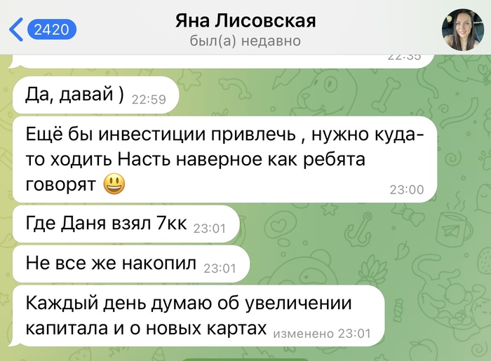 На протяжении месяца Яна активно изображала мою подружку, предлагала встречи в мск (и они были), активно рассказывала о своей семье, о муже — Сергее Фроленко. К слову, муж также был в общем чате и ни раз помогал Яне, предоставляя свои карты. А далее поступило предложение объединиться капиталами, чтобы % со сделок был больше. В этом и была глобальная ошибка. Но ведь объединить капиталы, когда уже несколько месяцев дружишь с классной семейной парой — вроде бы не такая плохая идея, правда? Тем более обучение связано с заработком, нужно учиться рисковать, подумала я.