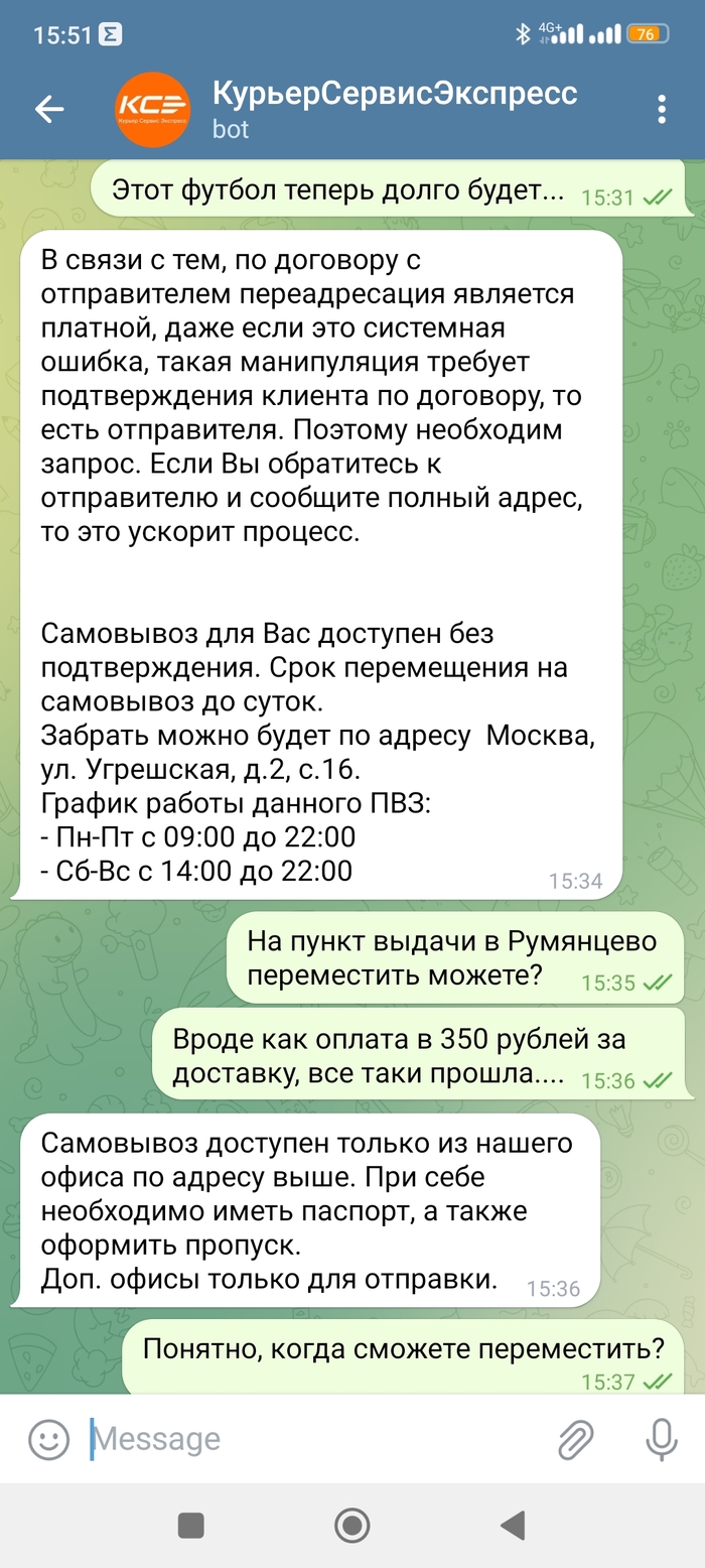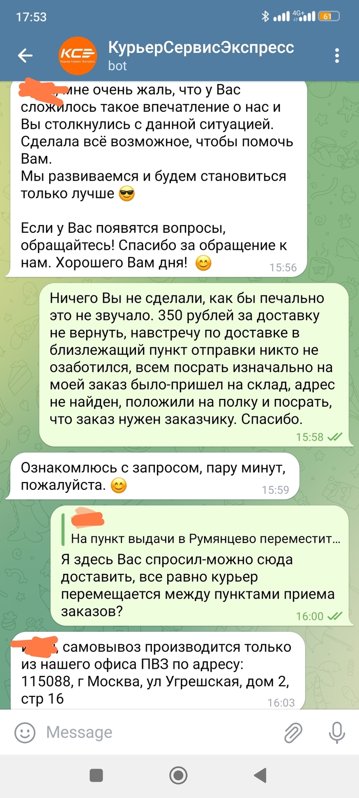 Буквально в этот же день заказ был передан в службу доставки КСЕ. И пропал. Написал в А24-предложили связаться с курьерской службой, пишу им в мессенджер , так как телефона нет. А дальше начинается цирк. На вопрос где заказ, ответ-у вас неправильный адрес доставки, напишите ещё раз.