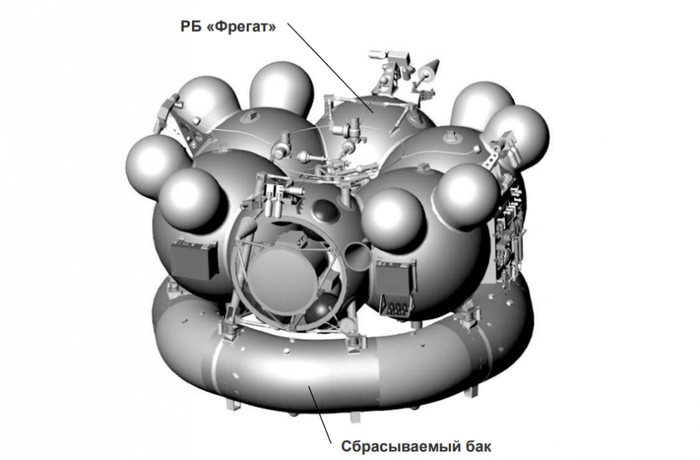 Разгонный блок «Фрегат» родился из межпланетной станции «Фобос» и представляет собой шесть сфер (две с горючим, две с окислителем, две с аппаратурой), слепленных вместе в шестиугольный тор, как шесть атомов углерода в бензольном кольце. Он тоже образует семейство вариантов, и предназначен для работы на ракетах полегче, в основном средних «Союзах», «Ангаре-3». Соответственно, и масса разгонных блоков поменьше — конструкция весит около тонны, тяга двигателя около двух тонн, масса высококипящих топливных компонентов (классические в космосе азотный тетраоксид — несимметричный диметилгидразин) составляет порядка 6-7 тонн. Время активного существования до 2 суток, количество включений до 7. На «Фрегатах» используют сбрасываемые топливные баки («Фрегат-М» и «Фрегат-МТ»), разрастающиеся до сбрасываемых блоков баков («Фрегат-СБ» и «Фрегат-СБУ», СБ означает сбрасываемый блок), что позволило увеличить запас топлива у последних «Фрегатов» до 10-12 тонн.