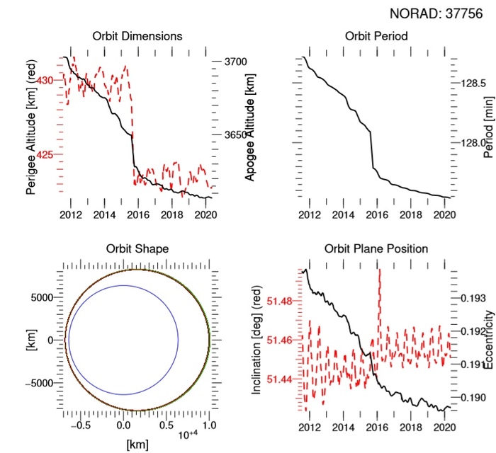 UPD Оказывается этот сбрасываемый бак начал разрушение еще в августе 2015 года, когда разделился на 24 фрагмента. На графике высоты это событие заметно как резкое падение высоты на 10 км в нижней точке и 70 км в верхней. Поскольку он состоит из четырех емкостей для компонентов топлива, возможно они могут взрываться по отдельности, а не все сразу.