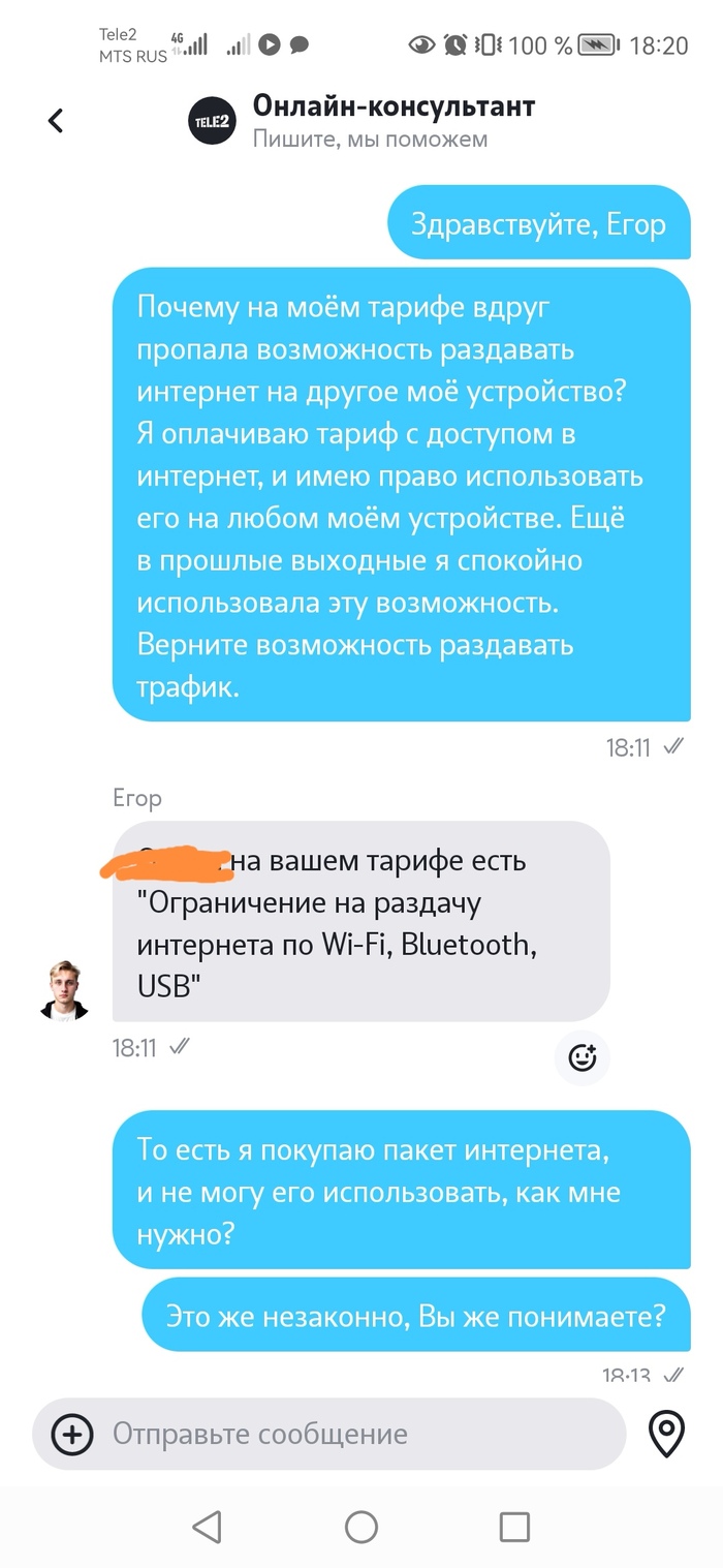 С тем же успехом я могу расширить экран своего смартфона на смарт ТВ, и пользоваться стриминговыми сервисами к примеру, так м.б. и за включение этой функции с меня нужно брать доп. плату? Ведь трафик который проходит через моё мобильное устройство, используется сторонним устройством, звоните в полицию еле2, вас наебывают!
