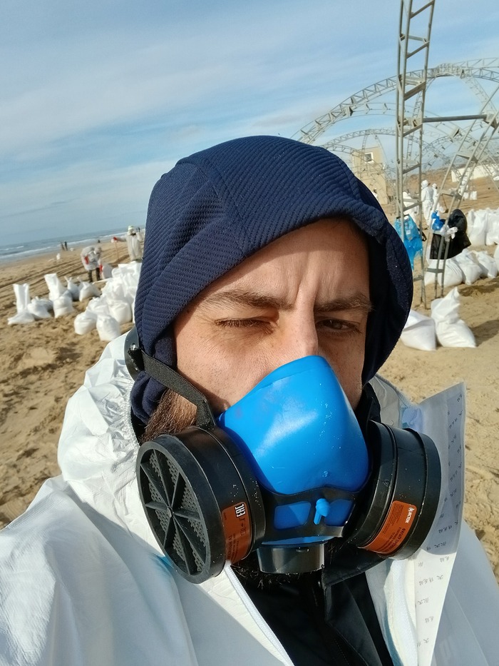 При беглом осмотре сложилось впечатление, что ситуация уже не такая плачевная, так как было видно песок без крупных разливов, хотя уже на подходах к пляжу стоял стойкий запах и мы решили надеть респираторы.