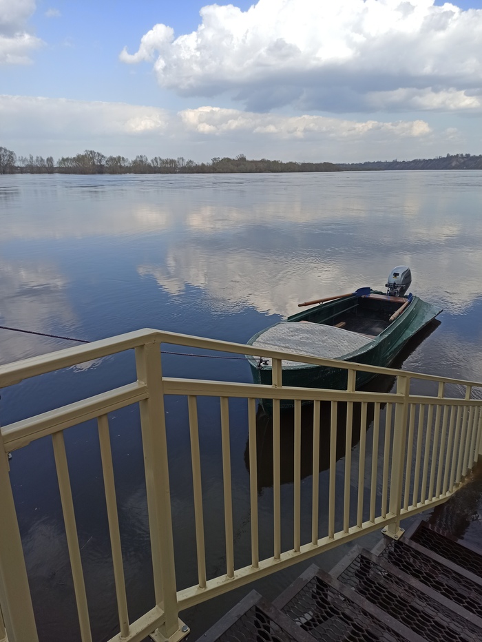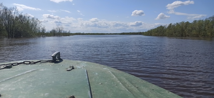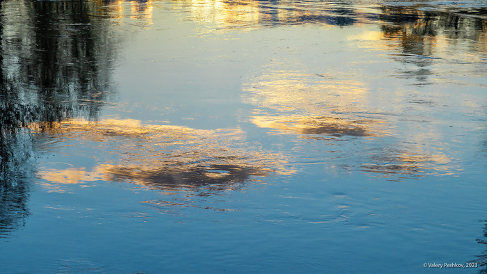 "Очень люблю бывать во время разлива именно в Мещёре. Большая вода к лицу небольшим Мещёрским речкам, а в погожий вечер - особенно. Глянцевая поверхность реки отражает закатные облака, а их рассеянный свет так красиво подчёркивает течение или его отсутствие, что от реки трудно оторвать взгляд."
