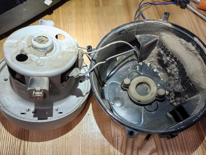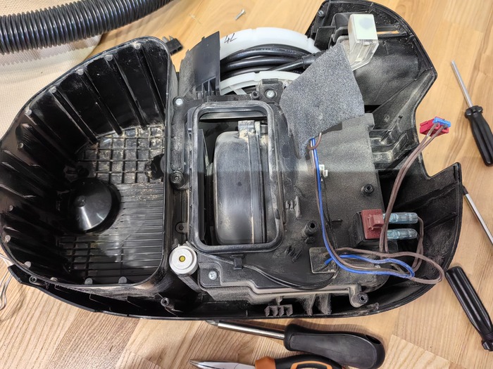 Если что, это фильтр НА ВЫХОДЕ, отсюда первая мысль - что же там творится в моторном отсеке? Для проверки включил пылесос без фильтров - двигатель странно шумит: значит, проблема не в фильтрах и нужно разбирать далее.