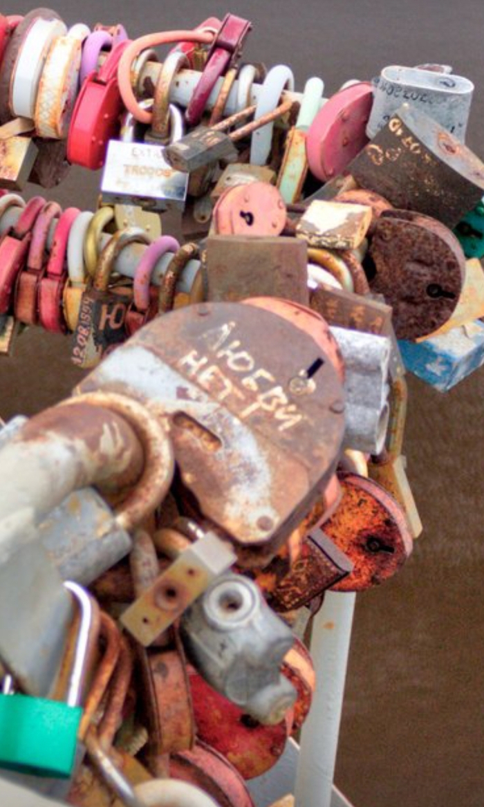 Был тут в выходные в Великом Новгороде. Шёл по Пешеходному мосту и обратил внимание на один замок, прикреплённый к конструкции, среди остальных.