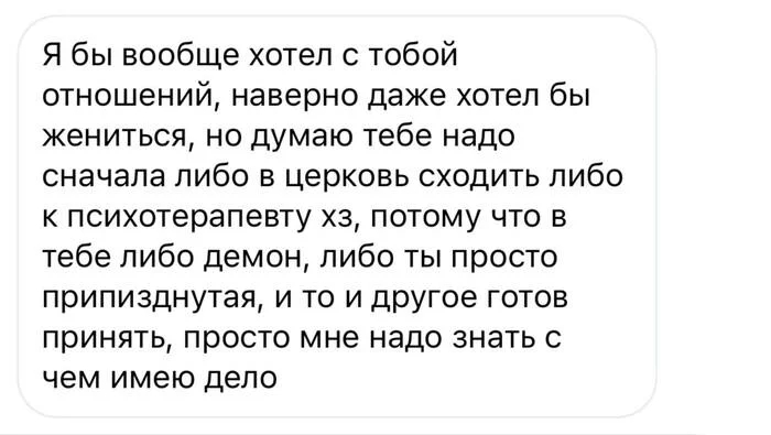 И за такую жизнь, сложился циничный взгляд. Были приняты правила игры, которые тоже стали устраивать - гостевые отношения. Но, с течением времени, (когда выбираешь мужчин от 35+) оказывается, что на гостевые они согласны только пока молодые, а потом им быт и семьи нужны (хотя у всех уже за плечами разводы). И вот и получается, что ты такая вся для отдыха, без прошлых разводов, детей, не тащишь в ЗАГС никого, но, как человек ты назуй не нужна....🫤 Вот, это я к чему - а чего расстраиваться-то (пардон, повторяюсь!)?!? Поэтому, эта волна (постов) попала мне в струю сейчас - встретила Мужчину. Поняла, что хочу с ним отношения. Поняла, что готова расти и меняться. А Мужчина сладко пел, пока до дела не дошло🤷 (там, обстоятельства общения ещё, получились специфичные), и как я ему, что, мол, давай жить-поживать, так всё хорошо и ты говоришь, что тебе всё нравится и всё устраивает. А он на это, сразу оказался интроверт, да и писать/звонить я не люблю, да и вообще, ты тут мозг-то не еби, я вот ещё подумаю....