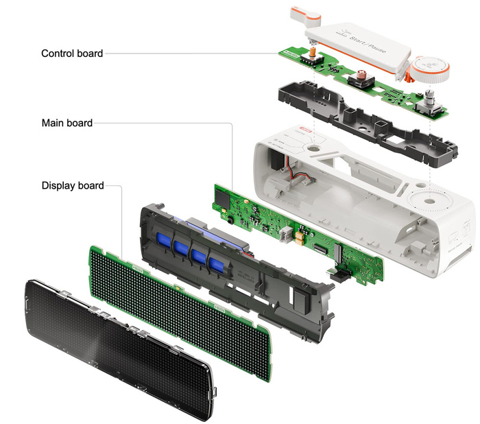 Мы спроектировали плату Developer Board так, чтобы ее можно было подключать даже к собранному устройству: достаточно снять внешнюю часть кнопки Start/Pause и прикрутить Developer Board на ее место. Электрическое соединение с платой управления обеспечивается через подпружиненные контакты (pogo pins).