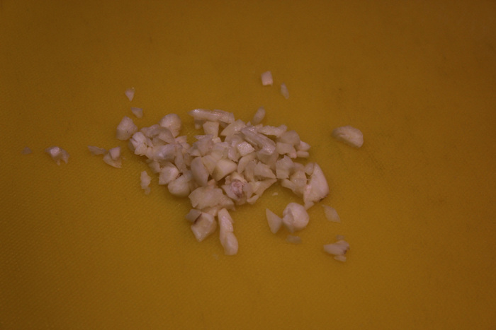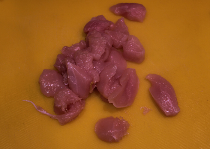 1) Куриное филе режем средними ломтиками. Чеснок также мелко рубим.