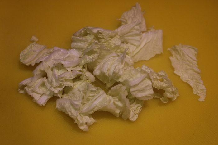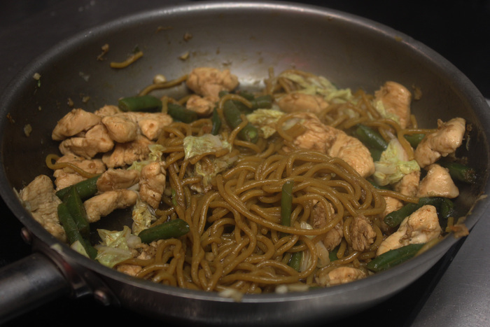6) Добавляем к жареному филе пекинскую капусту и лапшу, хорошенько перемешиваем и прогреваем. Важно чтобы в блюдо слегка плавало в соусе. Если влага слишком быстро упаривается, стоит снизить огонь и добавить ложку соевого соуса или водички.
