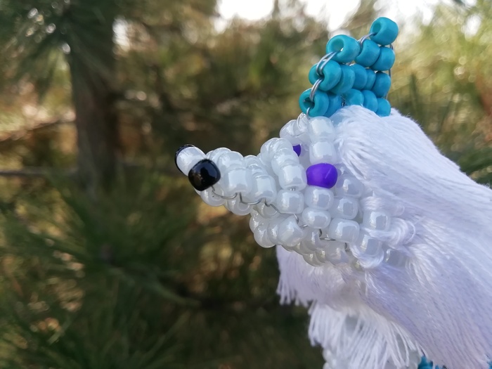Фигурка сделана из бисера. Длина тела с учётом хвоста 40см, высота 10см. Грива - нити мулюне. Передние лапы гнутся, тело подвижно. К сожалению дракон может только сидеть.