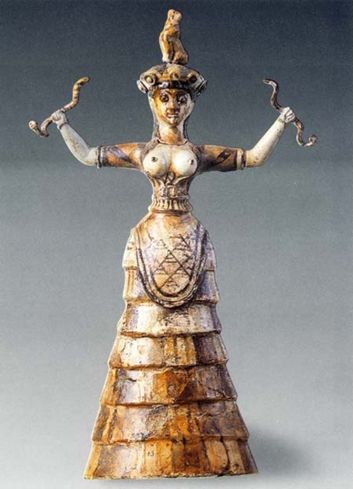 «Больше и больше этих евреев и родственных им племен стало проникать в страну Кефтиу с востока. Сначала это были гонимые евреями ханаанские родственники, почитавшие своим богом Ваала – великого Учителя из бычье-львиной цивилизации, пришедшей с других созвездий и отстроившего город Баальбек. Этот Ваал долго пытался противостоять анунакам, за что был ими назван в еврейских писаниях дьяволом. Поклонники Ваала заполонили страну Кефтиу. Они так же почитали Иштар. Культ Иштар в Кефтиу постепенно смешался с культом богини гимеру (киммерийцев), которую звали Келин и с местной Артемис (Артемидой). Но годы атлантического владычества и бежавших в Кефтиу потомков халдеев ханаанских сделали из нее новую смешанную богиню, несущую в руках змей и одетую в халдейское платье. Кстати, и поздние атланты носили похожие одежды с открытой грудью.