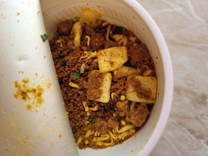 Откроем упаковку. Лапши в стакане примерно на 3/4 от объёма. Никаких пакетиков внутри нет, все ингредиенты добавлены непосредственно в стакан. Помимо порошка мы видим внутри сушёное мясо, зелёный лук и картофель.