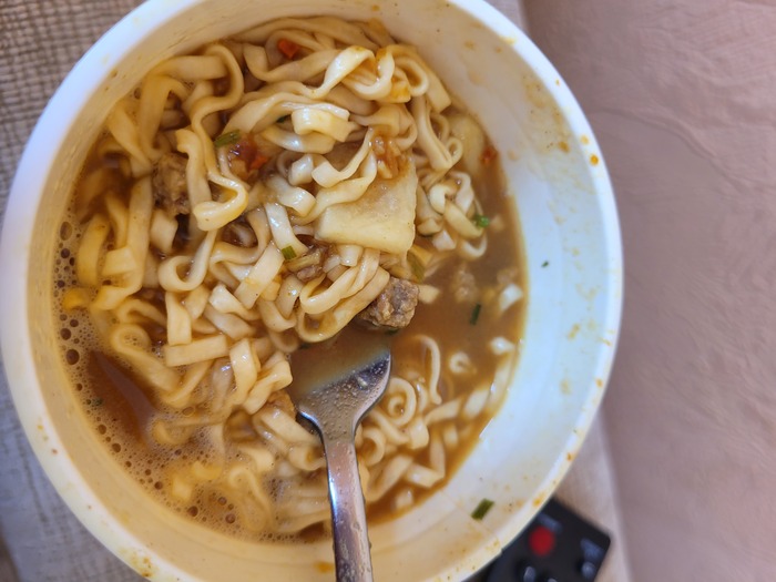 Перемешаем и приступим. Вкус насыщенный, пряный. Баланс соли - идеальный. Почти не остро, скорее, пикантно. Бульона очень мало, и он достаточно густой. Лапша тонкая, плоская, упругая - идеальная.