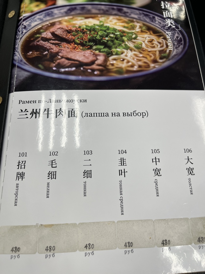 У парня на стойке выдачи можно уточнить, что подразумевается под каждой толщиной – он покажет фотографию блюда на планшете. «Толстая» лапша выглядит почти как длинные сочни к бешбармаку – широкая и плоская.