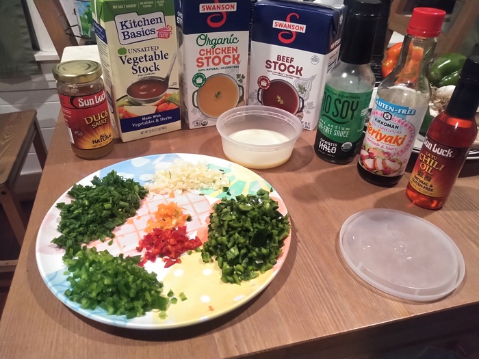 Различные бульоны и несколько соусов: соевый, террияки, китайский соус «утка», тайское масло чили. Жир от бекона, который мы сохранили с последнего раза, когда моя жена готовила бекон. Затем немного перцев: 1 хабанеро, 1 халапеньо, 1 красный острый перец чили, 1 перец поблано. И 1 зубчик чеснока и немного зеленого лука. Я не знаю, как сказать "chives" по-русски, приложение отображает его как "зеленый лук", но "green onions" - это нечто иное, чем "Chives". Chives намного тоньше и он просто зеленый.