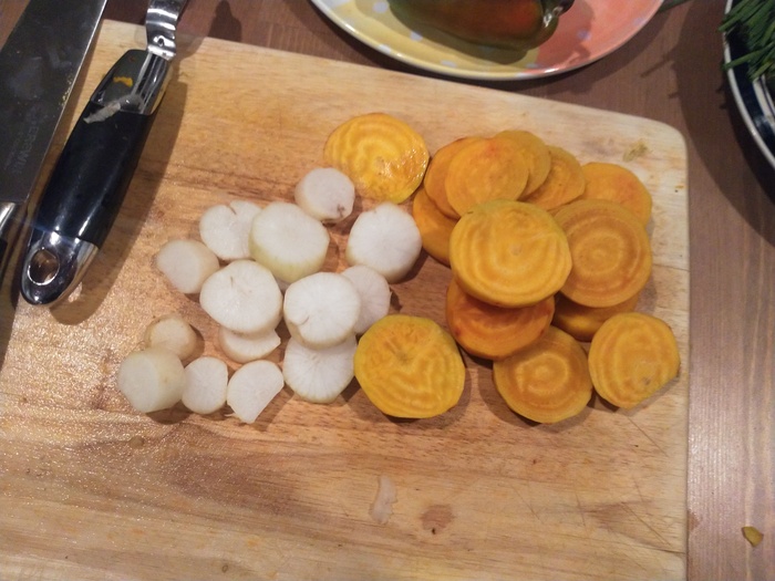 Редьку и свеклу — я сварил. Сначала очистил, потом порезал. Нарезал небольшими ломтиками, кипятил 15 минут, затем использовал в конце в качестве гарнира.