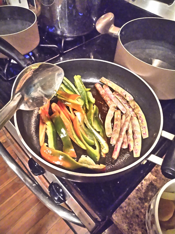 Далее идут гарниры, которые будут обжарены. Я использовал зелено-оранжевый перец и «клюква бобы». Я замочил бобы в воде на 10 минут перед этим, отрезал кончики. Фермер сказал мне есть их как эдамамей, только бобы внутри, без оболочки. Бобы я обжаривал 20 минут, перцы — около 12. Я использовал немного тайского масла чили и немного оливкового масла.