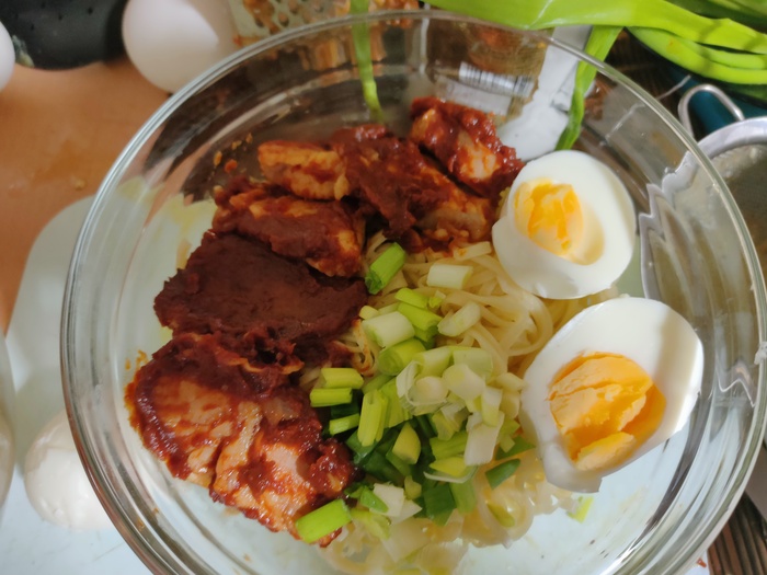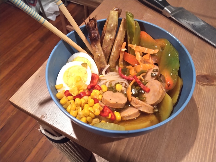 В качестве гарнира в рамэне были свекла, редька «Дикон», понятия не имею, как она называется по-русски, 2 зелено-оранжевых перца и фасоль «клюква». Я никогда раньше не использовал такие свеклу, редис или фасоль, так что это было приключение. Забавный факт: пока я печатаю это с помощью приложения для исправления грамматики, оно постоянно меняет мой пол на женский. Думаю, ИИ предполагает, что если вы готовите, то вы женщина)
