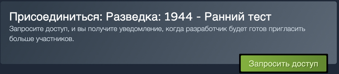 Для записи на плейтест пройди по ссылке на страницу игры в Steam и нажми на зеленую кнопку “запросить доступ”, расположенную под скриншотами Разведка: 1944.