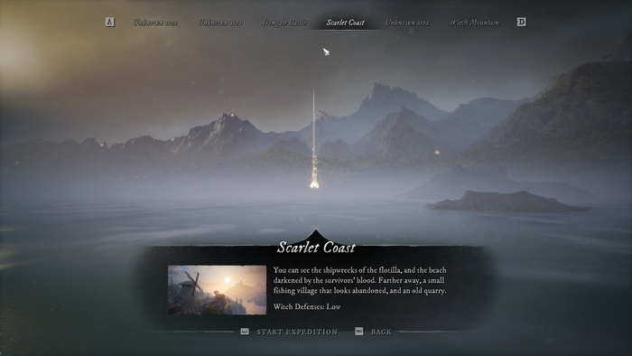 Выбор локации для экспедиции осуществляется на портале. На данный момент доступно к исследованию две карты, вторая из которых откроется после убийства босса в Scarlet Coast, но уже можно примерно оценить, сколько областей будет доступно для исследования.