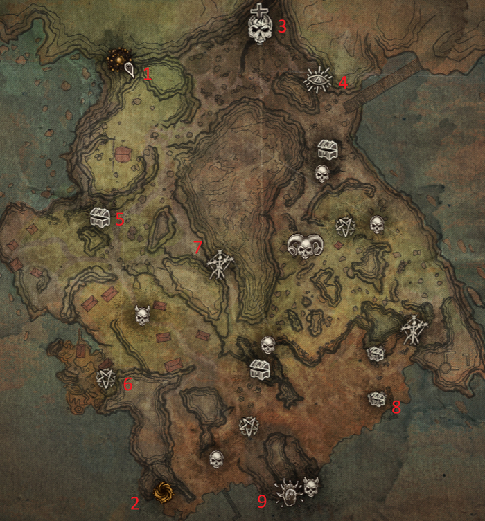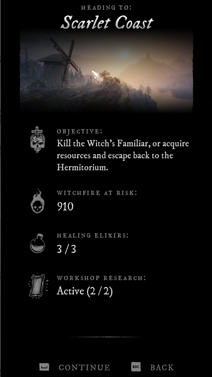 Кроме перечисленных точек на карте черепами обозначаются лагеря врагов, сложность которых можно оценить по "прокачанности" черепа. Ещё в текущем забеге не отображаются области с ловушками. Дополнительно на локация раскиданы проклятые предметы, назначение которых пока не совсем ясно. В данный момент при поднятии они могут вызвать проклятие. И самое главное - ваши останки с предыдущих забегов, сохраняющие весь собранный ведьмовской огонь, подобно душам в Dark Souls. В начале игры их потеря подобна катастрофе.