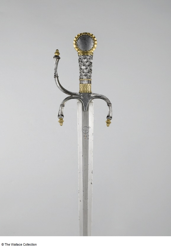 Эфес итальянский, второй четверти XVII века. Да, он полностью металлический - в тёплой Италии холодная железяка в руке вызывает гораздо меньше эмоций. Крупное навершие обеспечивает очень низкий центр масс. Когда приснопамятный мастер Сильвер, ругая рапиру в своих "Парадоксах защиты", писал, что эфес совсем не защищает руку(потому что его практически нет), а неспособность внятно рубить делает технику и тактику ущербными - речь шла именно о таких штуках.