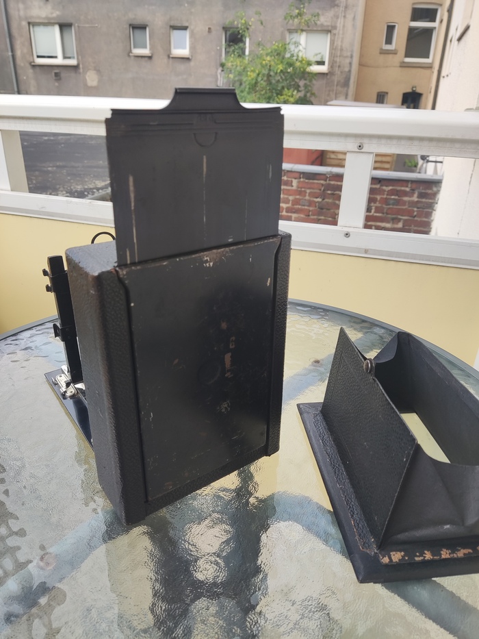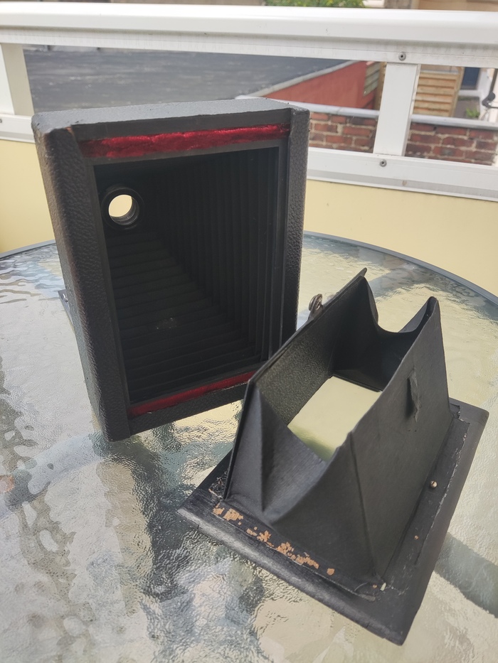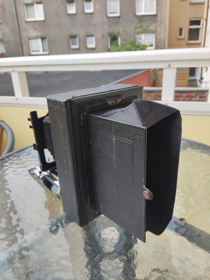На задней стенке есть шторка с матовым стеклом, по которому производится фокусировка.