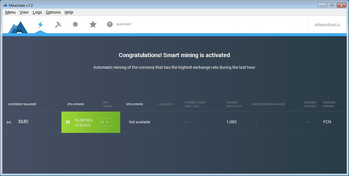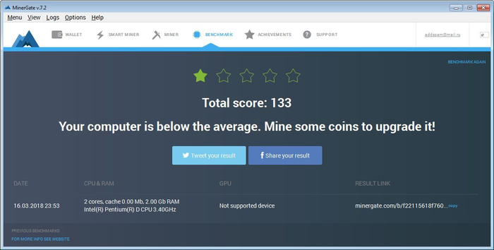 На Windows XP ни одна программа для майнинга не запустилась, но я специально для этого поставил ее на старую материнскую плату и Pentium-D, установил Windows 7 64-бит и попробовал помайнить. К сожалению, как я ни пытался комбинировать драйверы, компоненты системы и т. д., мне не удалось включить поддержку OpenCL, хотя в характеристиках этой карты и указана поддержка OpenCL 1.0. Поэтому все майнеры или не запускаются, или показывают отсутствие поддержки OpenCL. Однако майнер MinerGate запустился и вот что он показал.