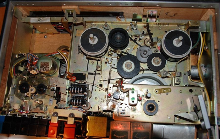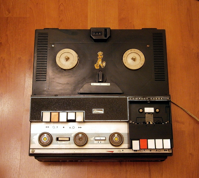Практически «два в одном». Катушечный и кассетный магнитофон в одном корпусе. Никаких шнуров не нужно для перезаписи. Жаль, что мало сохранилось фотографий «внутрянки».