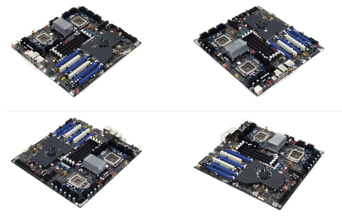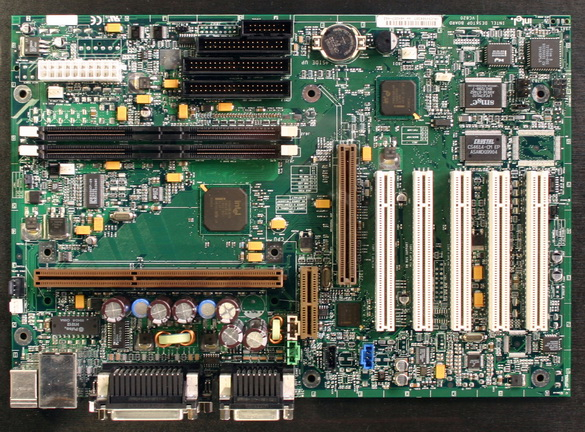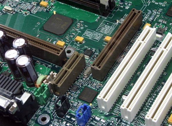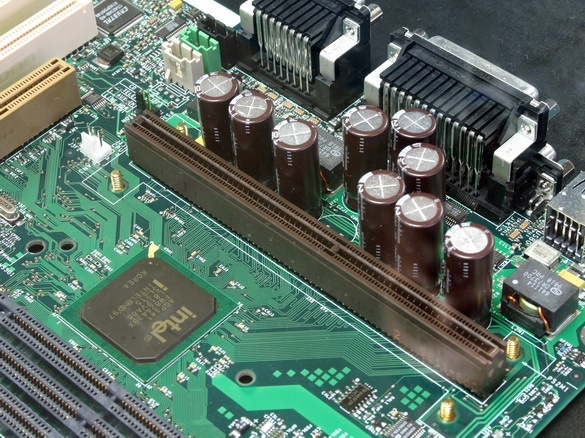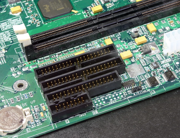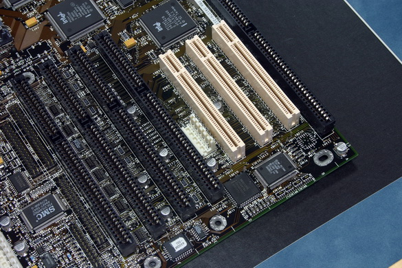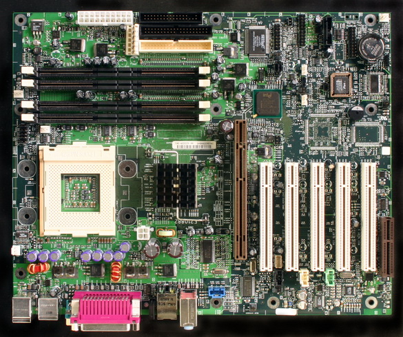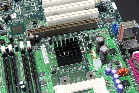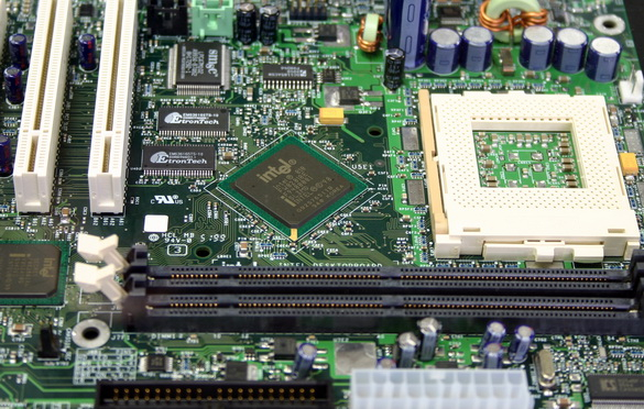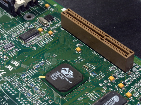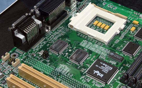 Прямоугольные чипы вокруг сокета CPU – это кэш-память, поскольку кэш L2 ещё предстояло интегрировать в процессор. А большие квадратные чипы? Это микросхемы ввода/вывода.