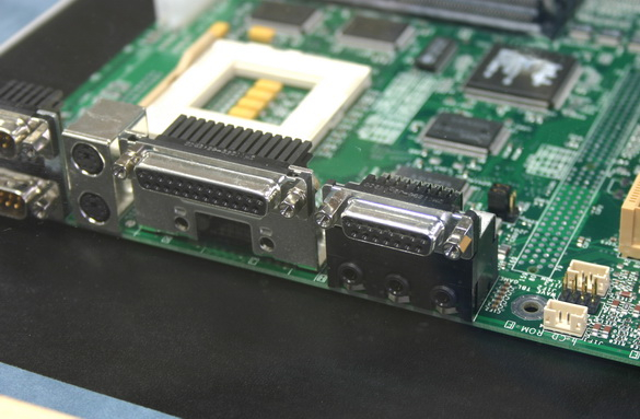 Если посмотреть на заднюю панель ввода/вывода, то можно заметить небольшое чудо – рождение интегрированных компонентов материнской платы. Забудьте о картах Super I/O. Теперь у нас интегрированы последовательный, параллельный и игровой порты. Помните, кстати, 15-контактные игровые порты для джойстиков (их поддержка исчезла под Windows Vista)? Под игровым портом располагаются три звуковых разъёма, за которые отвечает звуковой контроллер Crystal Semiconductor ASIC, расположенный между третьим и четвёртым слотами PCI. В правой части фотографии внизу можно заметить четырёх контактный разъём для подключения CD-ROM, чтобы система могла воспроизводить с него музыку (Audio CD).