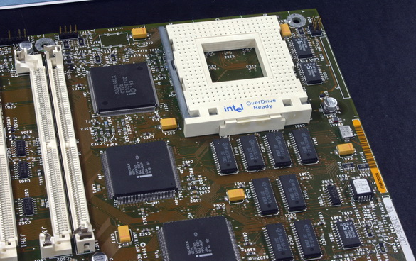 На очень старых платах можно заметить, что некоторые слоты SIMM ближе к краю наклонены под углом 45 градусов. Это было сделано из-за ограничений корпуса по высоте платы, чтобы с планками SIMM не контактировали жёсткие диски или блок питания. Обратите внимание на штамп “OverDrive Ready” на сокете CPU (Socket 4), который указывает на возможность установки процессоров OverDrive. Socket 4 поддерживал 5-В процессоры, то есть подходил для установки только CPU Pentium 60 и 66. В последующий Socket 5 (3,3 В) можно было устанавливать процессоры от Pentium 75 до 133, при этом у него были смещённые контакты по сравнению с Socket 4. Процессор Pentium OverDrive мог устанавливаться в старые системы Socket 4, при этом он работал на частоте, в два раза превышающей оригинальную (120 или 133 МГц). В итоге процессор работал медленнее, чем “настоящие” CPU на 120 или 133 МГц, но зато являлся хорошим вариантом для модернизации системы. Intel выпускала процессоры OverDrive для Socket 5, Pentium Pro и наиболее известную модель под сокет 486, которая позволяла ядру Pentium работать на 486 платформе с той или иной долей успеха.