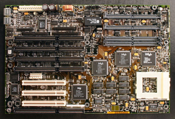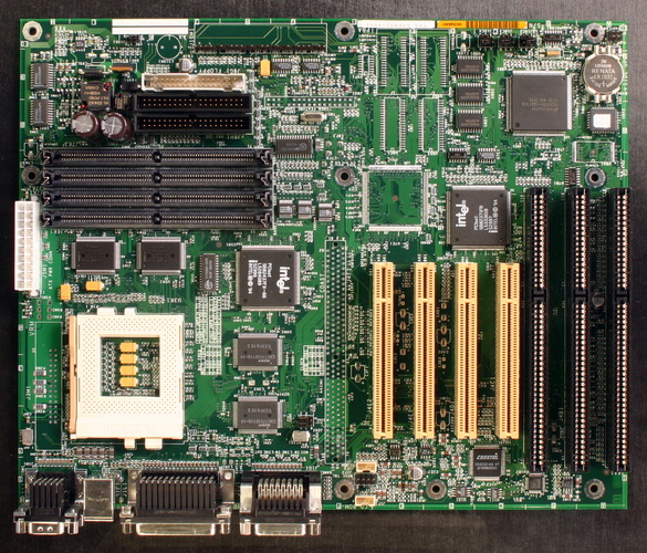 У платы есть несколько приятных особенностей. Дизайн Socket 7 был в то время новинкой, причём не только из-за того, что обеспечивал раздельные линии напряжения (Что? Ещё за 10 лет до того, как AMD подняла такую шумиху вокруг раздельного питания у Barcelona?). Он был обратно совместим с процессорами Socket 5. Да, Intel представила обратно совместимый сокет процессора. Что ещё лучше, Socket 7 работал с процессорами от AMD, Cyrix, IDT и других компаний. Да, получилась такая открытая платформа. Но чудо длилось недолго. Кстати, вокруг сокета CPU расположены 32-битные чипы SRAM от Sony.