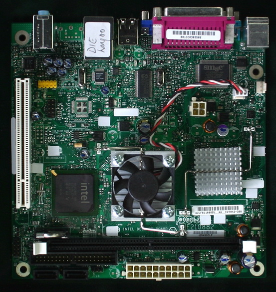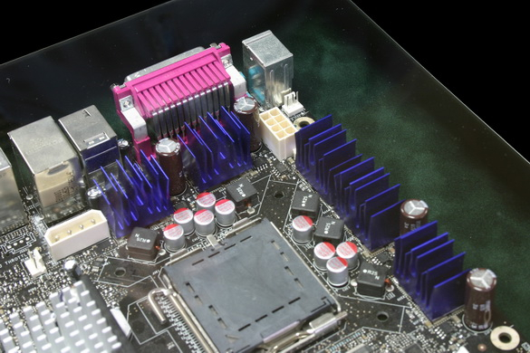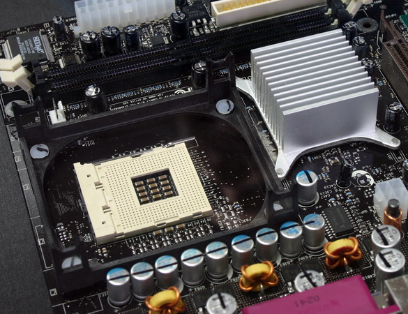 Вероятно, вам интересно, почему северный мост развёрнут под углом 45 градусов? Нет, это не странный предшественник теперь уже почившего форм-фактора BTX. Просто в некоторых случаях такой поворот упрощает и сокращает длину дорожек от северного моста к процессору, памяти, южному мосту и слоту AGP (в данном случае его нет). Поскольку крепёжные отверстия не изменились, никакого нарушения форм-фактора ATX/microATX здесь нет.