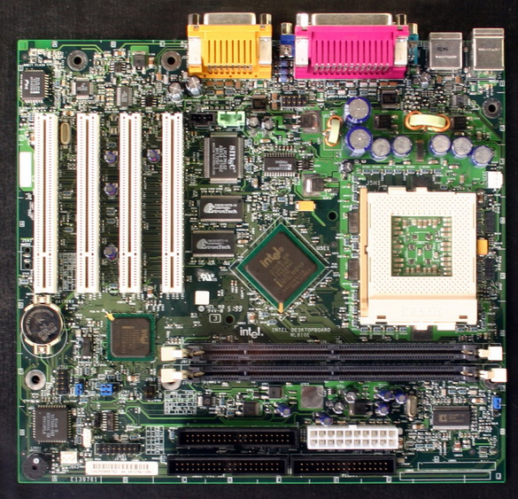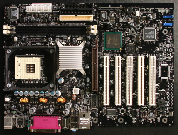 Garibaldi – полноразмерная материнская плата для рабочих станций с форм-фактором ATX, в которую можно устанавливать процессоры Pentium 4 с шиной 400 МГц. Нацеленность на high-end подтверждается наличием 50-Вт слота AGP Pro 50 (4x). В то время видеокарты Pro 50 продавались по цене около $1500 – это примерно то же самое, что конфигурации 3- или 4-way SLI сегодня. Плата была выпущена в 2001 году и стала одним из последних продуктов Intel с памятью RDRAM, причём на Garibaldi можно было устанавливать объём до 2 Гбайт. Есть и некоторые инновации. Обратите внимание на разъём дополнительного питания ATX12V около сокета CPU, гнездо дополнительного питания, неуклюже примостившееся рядом с гнёздами подключения накопителей, а также радиатор для северного моста – первый кулер Intel для чипсета, насколько мы знаем.
