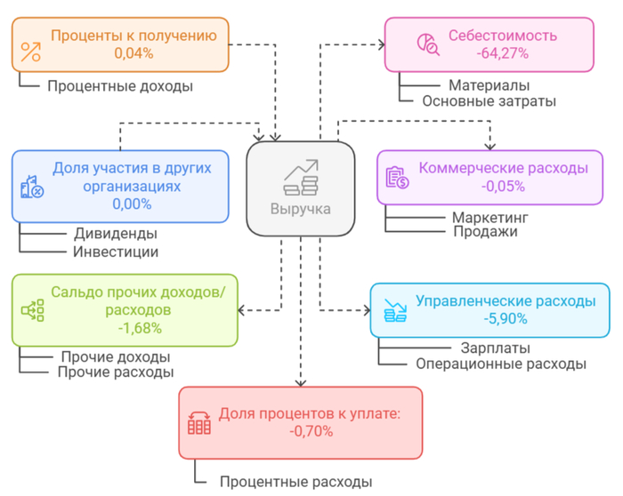 6. Проценты к получению: Медиана 0,04% от выручки ниже отраслевого уровня (0,12%). Это говорит о том, что у компании относительно небольшой объем свободных денежных средств, размещаемых под процент, или менее активная политика в этом направлении по сравнению со средним показателем по отрасли.