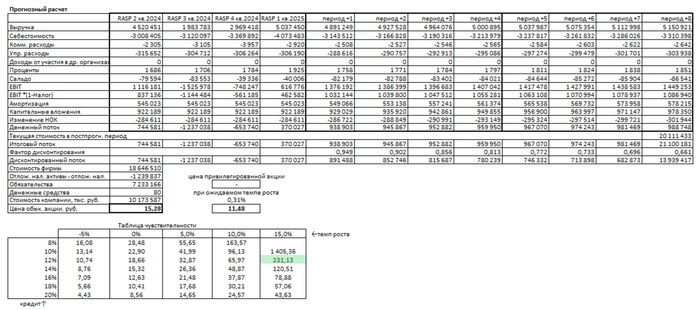 Текущая рыночная цена акции «Распадской» составляет 229,55 рублей. Анализ таблицы чувствительности нашей DCF-модели показывает, что цена, близкая к текущей рыночной, могла бы быть теоретически оправдана только при сочетании крайне оптимистичных допущений: например, если бы средняя процентная ставка по кредитам для компании составляла около 12% (что значительно ниже актуальных рыночных ставок) и темп ежегодного роста выручки достигал 15%.