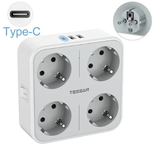 Настенная розетка TESSAN предназначена для организации питания нескольких устройств в одном месте. Конструкция включает четыре розетки переменного тока и три USB-порта с выходом 5 В и током до 2,4 А, что удобно для одновременной зарядки гаджетов и подключения бытовой техники.