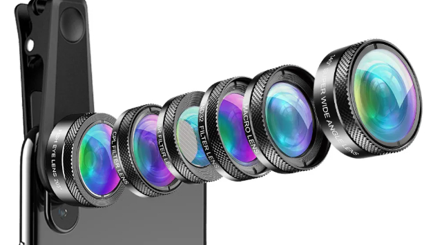 Комплект объективов APEXEL формата 6 в 1 предназначен для расширения возможностей камеры смартфона при фото- и видеосъёмке. В набор входят объектив «рыбий глаз» с углом обзора 205 градусов, широкоугольная линза, макрообъектив с увеличением 25×, а также фильтры CPL, Star и ND32.