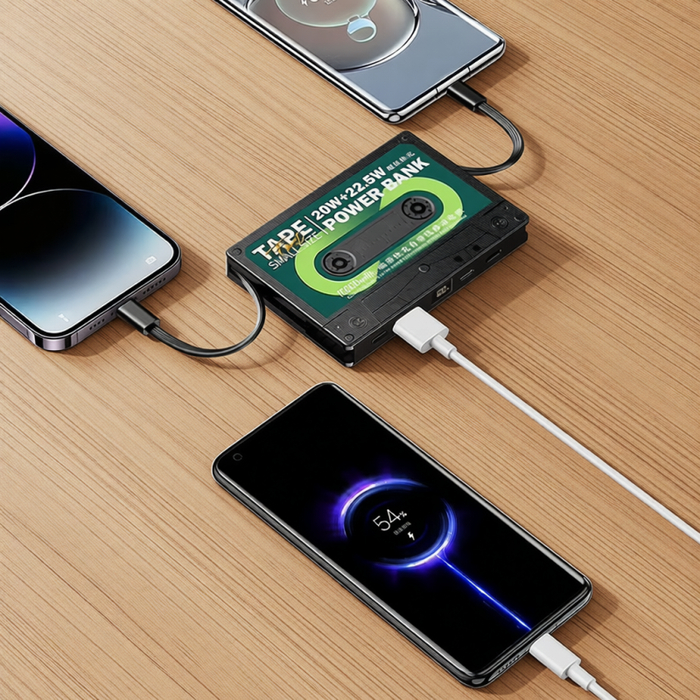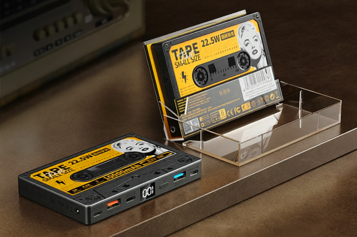 Внешний аккумулятор сделан в виде кассеты и весит около 185 граммов при ёмкости 10 000 мАч. Размеры 10,8 х 7,6 см позволяют положить его в карман рубашки или боковой отсек рюкзака.