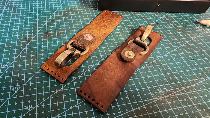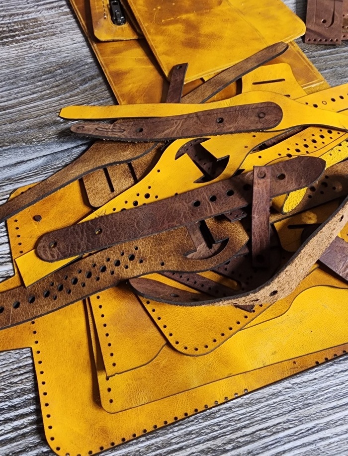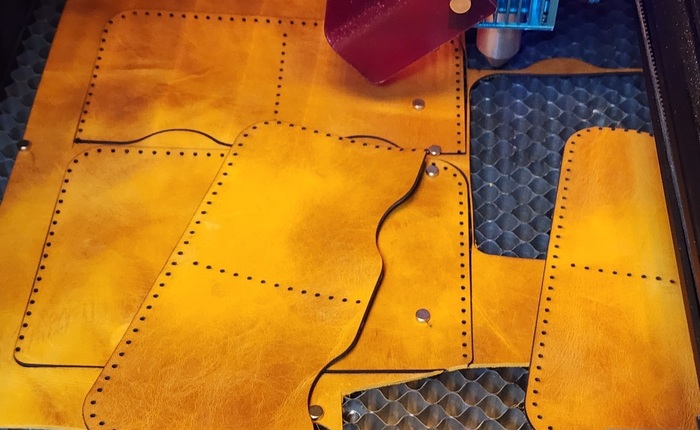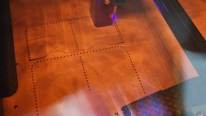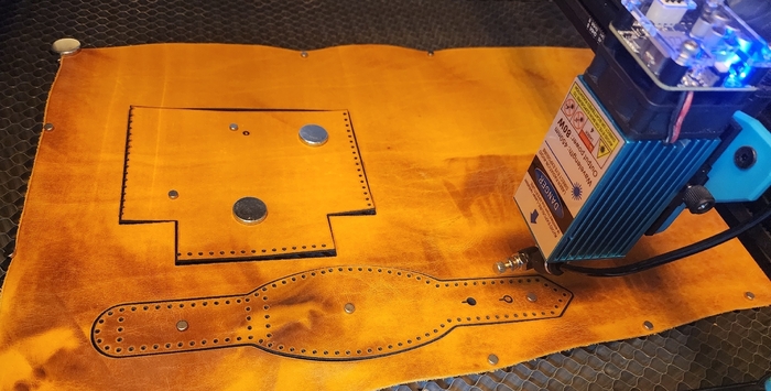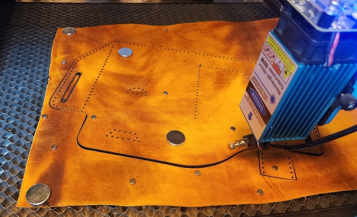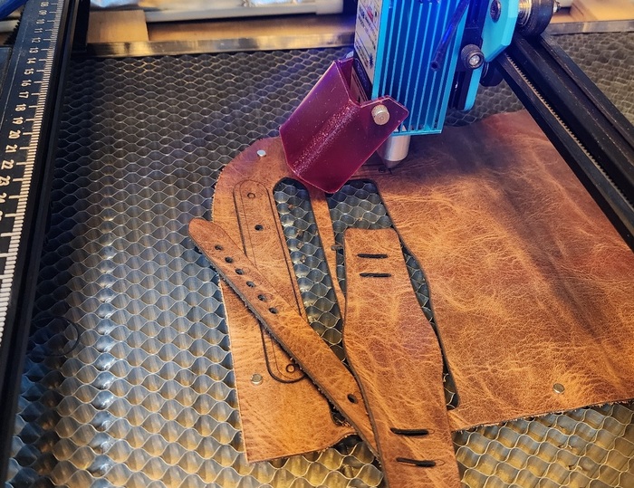 Пример работы с поменянной "головой" на 80 Вт (питание прокладывал отдельно). Резка натуральной кожи (ремешки). Пованивает — не без этого, нужна вытяжка. Ну и заниматься таким лучше в гараже или мастерской, а то соседи скажут "спасибо". Как в прочем и от резки фанеры в жилом доме/на балконе. С помощью такого лазерного гравера удобно резать шаблоны и лекала. Также раскрою поддаются тонкие синтетические материалы — фоамиран, фетр, тонкие пластики, пенокартон и прочее.Очень нужен воздух в зоне реза — тогда не будет вот таких прижогов и обугленных краёв. Но в целом неплохо, то есть мощности вполне хватает. Надо будет подумать, как исправить ситуацию с воздухом с минимальным вмешательством. Да и "голову" я бы поставил помощнее, но это отдельная история.