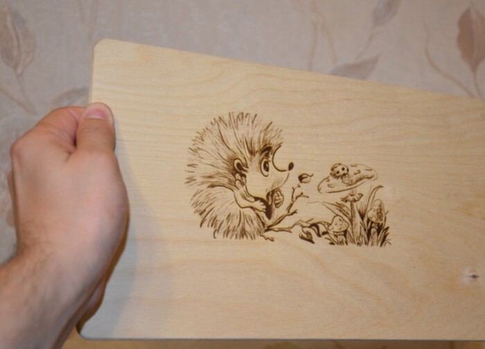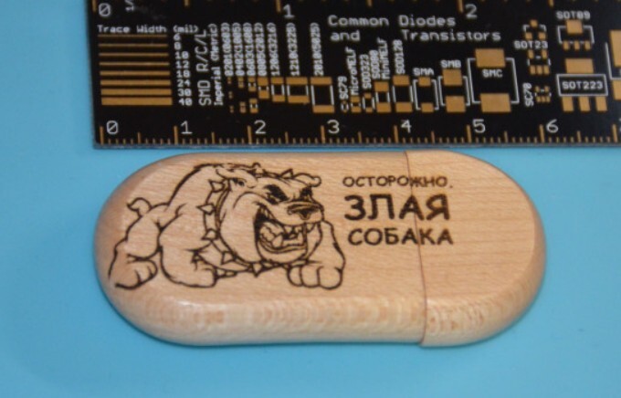 Собственно говоря, вот то самое применение, для которого и выбирал данный компактный гравер. Это нанесение рисунка на заготовки из дерева: шкатулки, подарочные коробочки, флешки и подобные безделушки. Процесс быстрый, практически бездымный (дымят только ПВХ чехлы от смартфонов). Для кого-то это может стать подспорьем в хобби. Для кого-то — началом нового бизнеса. Кто-то сможет наконец-то отгравировать на память доску для любимой тёщи (разделочную).