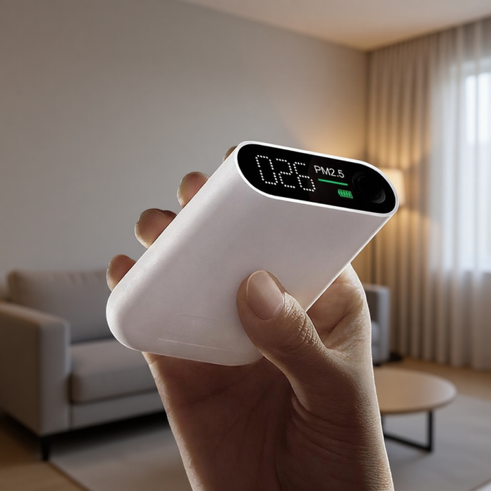 Портативный датчик качества воздуха с беспроводным подключением отслеживает концентрацию загрязнений, температуру и влажность в комнате в реальном времени. Трёхцветный индикатор на HD-дисплее показывает состояние воздуха - зелёный означает нормальные показатели, жёлтый и красный сигнализируют о превышении норм.