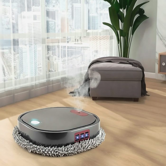 Робот-пылесос с автоматической системой уборки запускается одной кнопкой и работает в режиме сухой или влажной чистки, определяя степень загрязнения. Эффективный всасывающий механизм захватывает пыль и крошки со всех поверхностей, а встроенная ультрафиолетовая лампа убивает бактерии во время движения по полу.