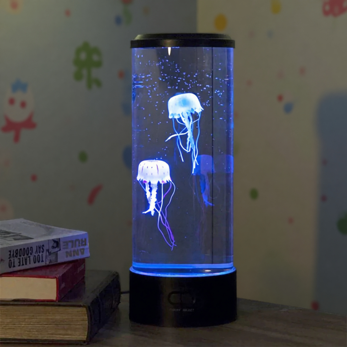 Вода в резервуаре меняет цвет плавно, переходя между несколькими оттенками в течение нескольких секунд. Медузы движутся непрерывно, пока светильник включён, создавая эффект спокойного плавания. Шум от насоса минимален, около 30 децибел, так что он не помешает во время работы или сна.