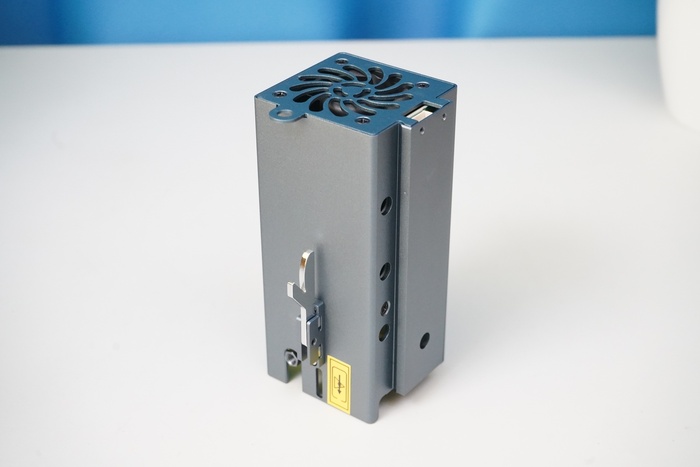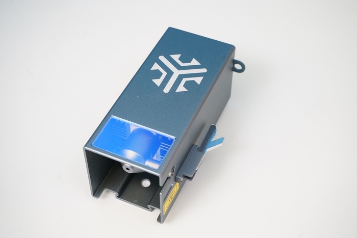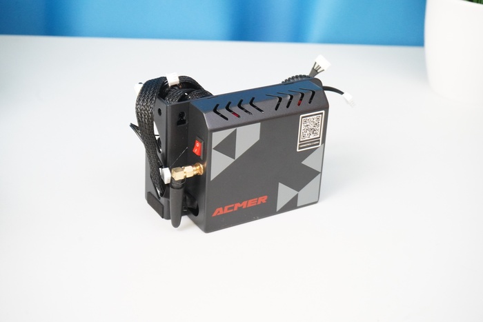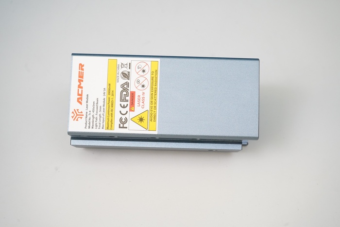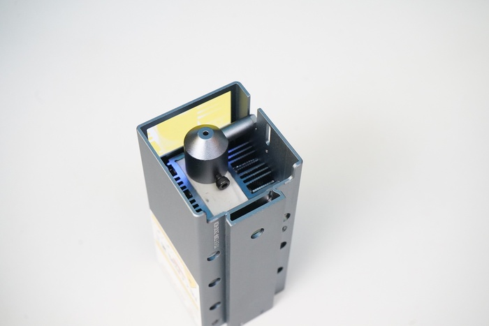 Есть три версии комплектации лазерного гравера P1S Pro от Acmer — это "головы" на 6 Вт, на 10 Вт и на 20 Вт. Питание лазерной "головы" 24 Вольта (и 3 Ампера, то есть голова потребляет где-то 60 Вт). Есть плюс —массивный радиатор для отвода тепла. Также отмечу штатную воронку с резьбой на сопле — можно подключить воздух. Надо будет обязательно сделать, так как с подачей воздуха в зону реза качество гравировки и резки сильно улучшается.