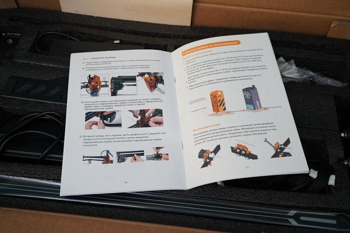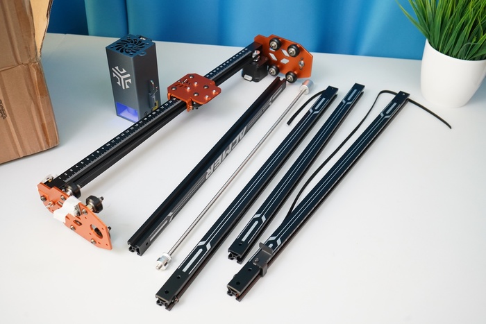 Что понравилось — гравер заработал сразу после минутной сборки. Корпус весь металлический — это конструкционный алюминиевый профиль плюс сделанные на точной резке каретки (а также ножки-стойки и кожух лазера).