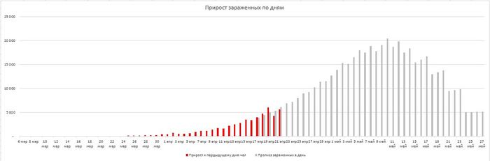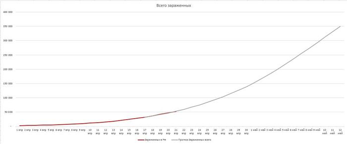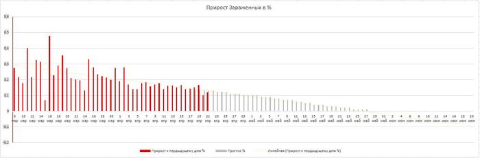 Не считаю себя аналитиком и не претендую на истину, но построенный прогноз на основании статистики пока что исполняется. Таким образом по линейному тренду % зараженных ежедневно снижается (% от количества зараженных на предыдущий день). Значит, при позитивном прогнозе к 12 мая мы выйдем на плато с общим количеством зараженных в 350 000. Рост количества зараженных прекратится в июне на цифре 520 000 зараженных.