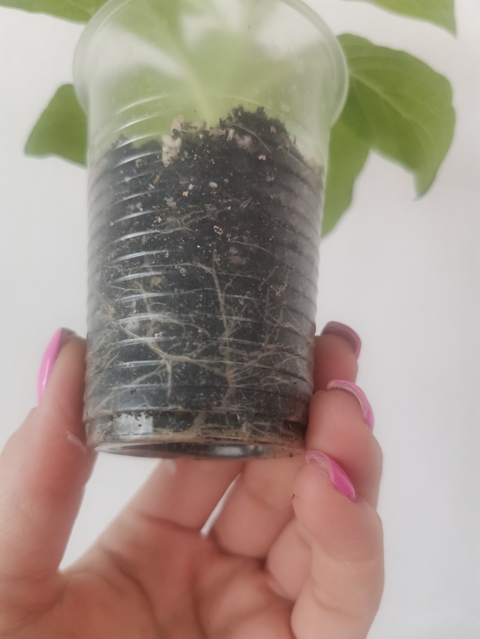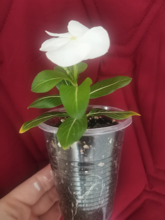 Конец сентября 2025 года. Решаюсь на эксперимент - пересадить эту кроху в горшок - а вдруг зимой зацветёт. Так как петуния проросла прям между камней - пришлось практически вырвать ее, оставив только одну ниточку корня.